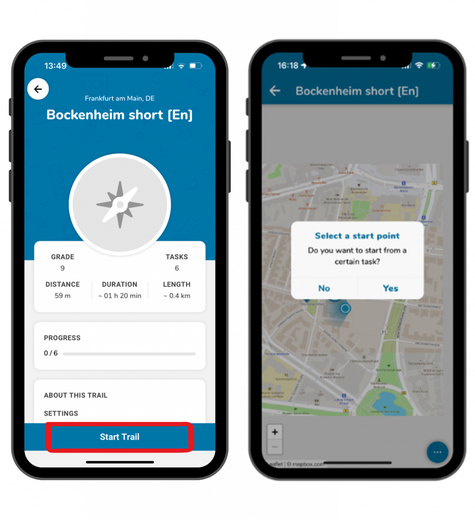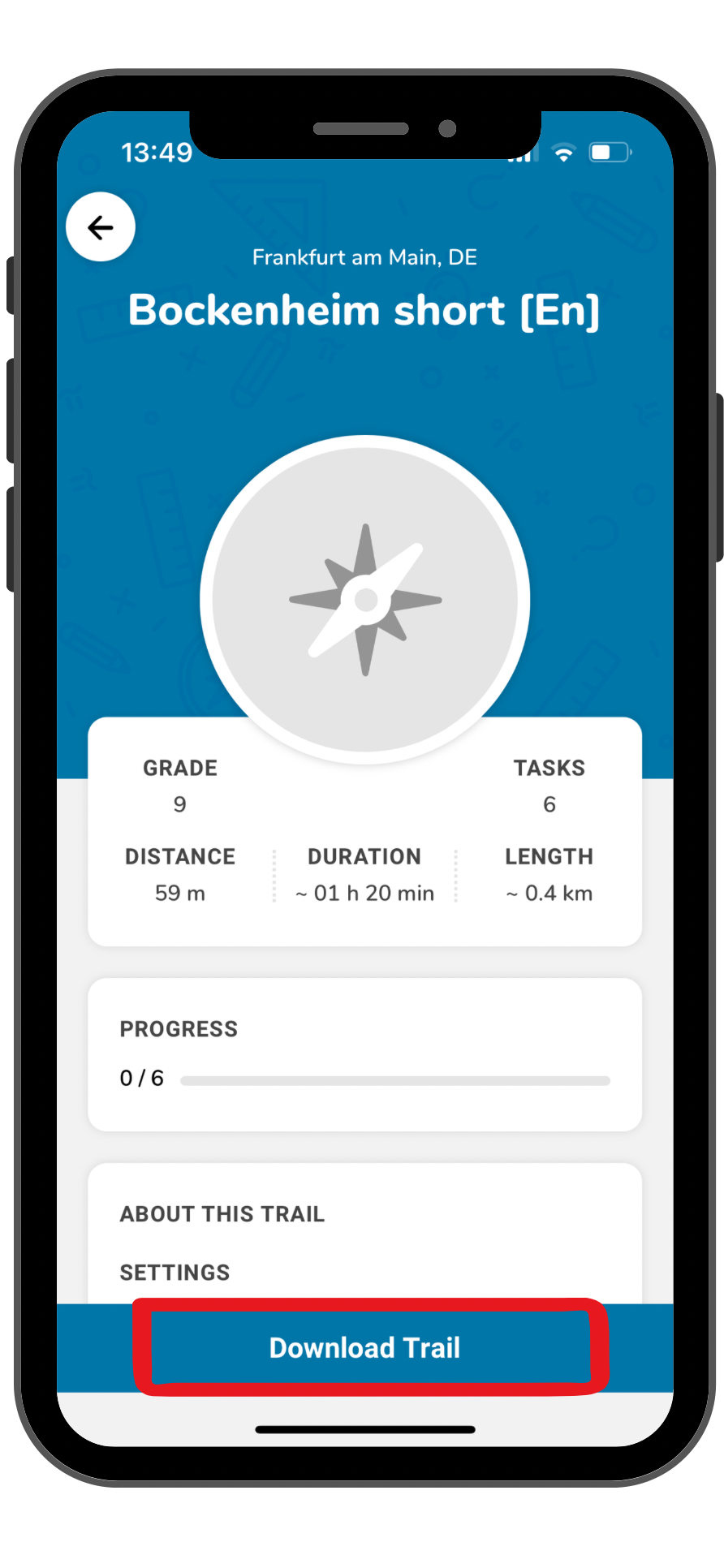 The house icon stands for the start page of the app, the location icon for searching for trails and the download icon for your saved trails.