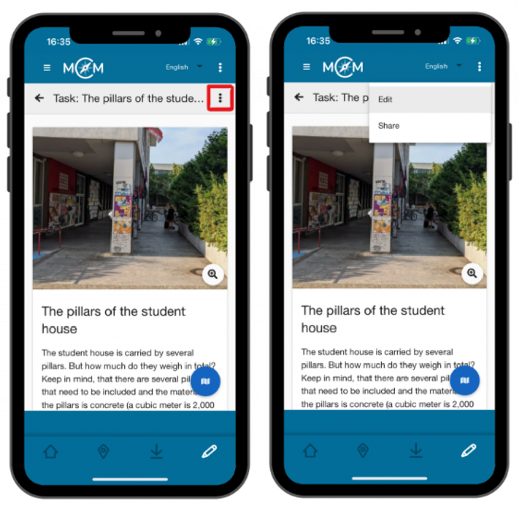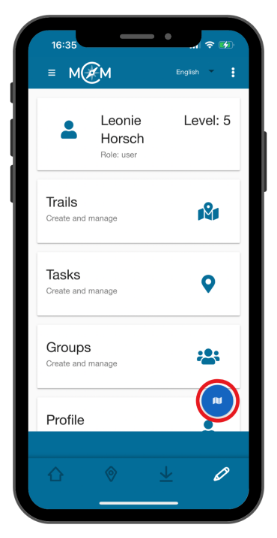 In contrast to using the web portal on a tablet or laptop in the browser, you will find the various management options for your content under the three dots at the top left if you have clicked on a task, a trail or a group.