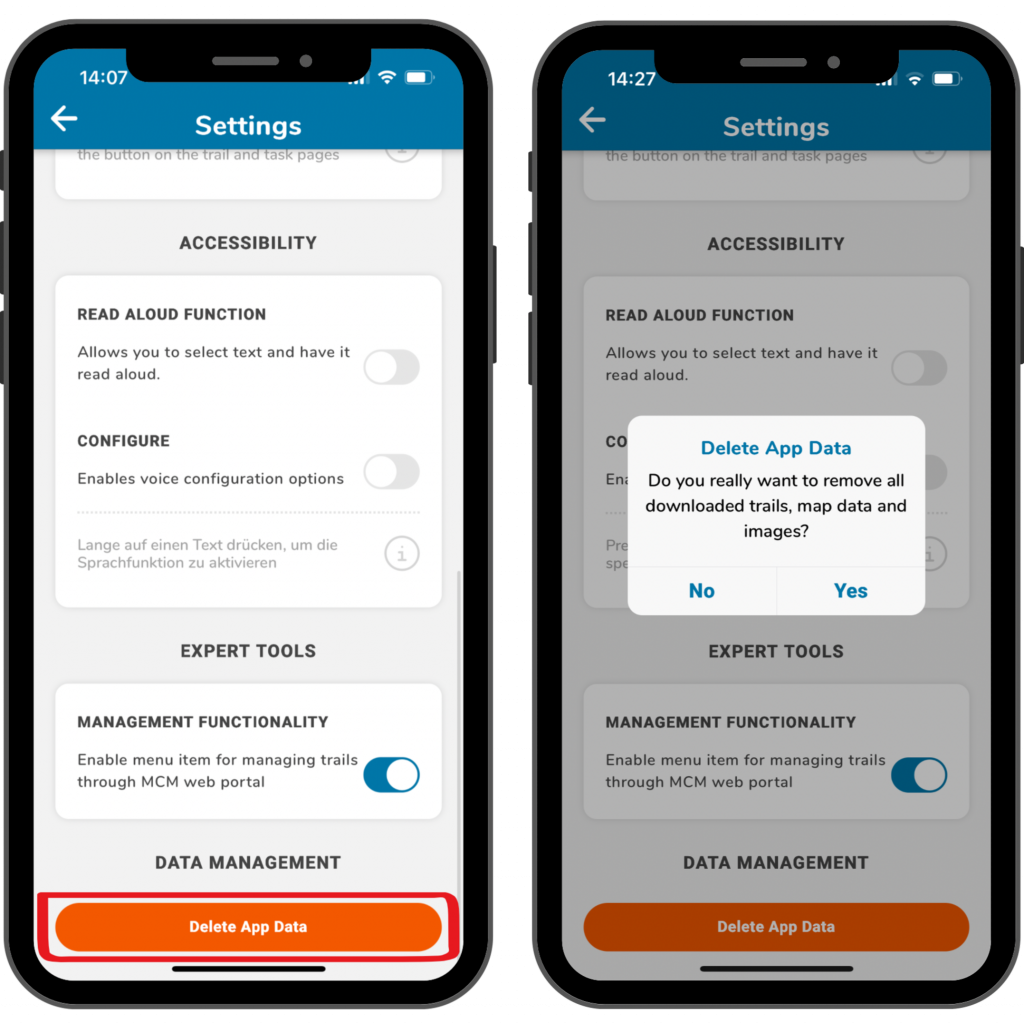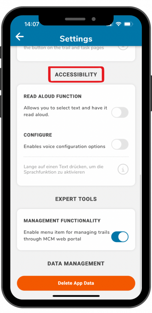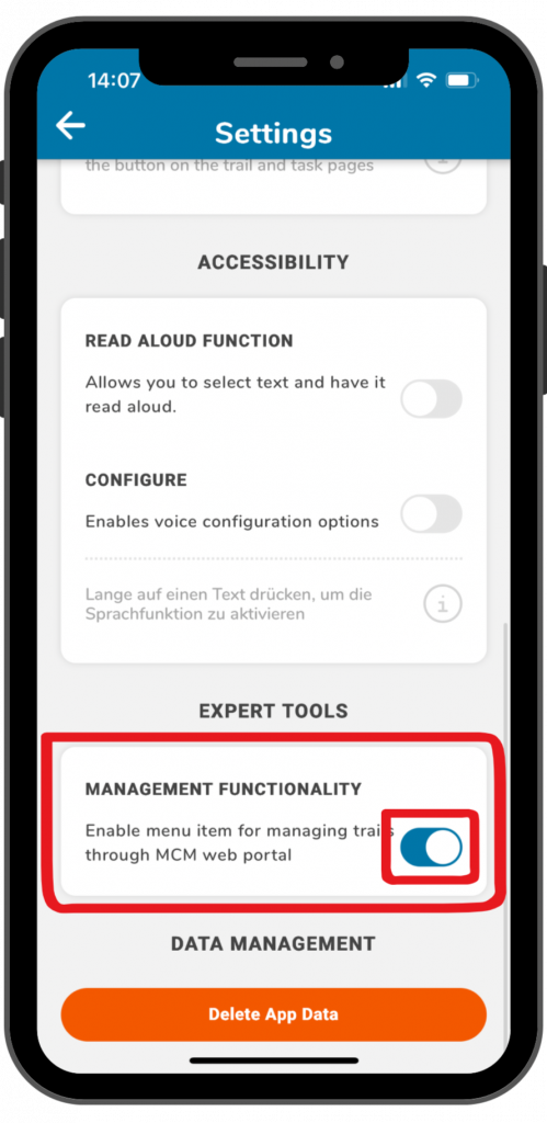 To be able to use the web portal in the app, you must first activate the management option in the settings.