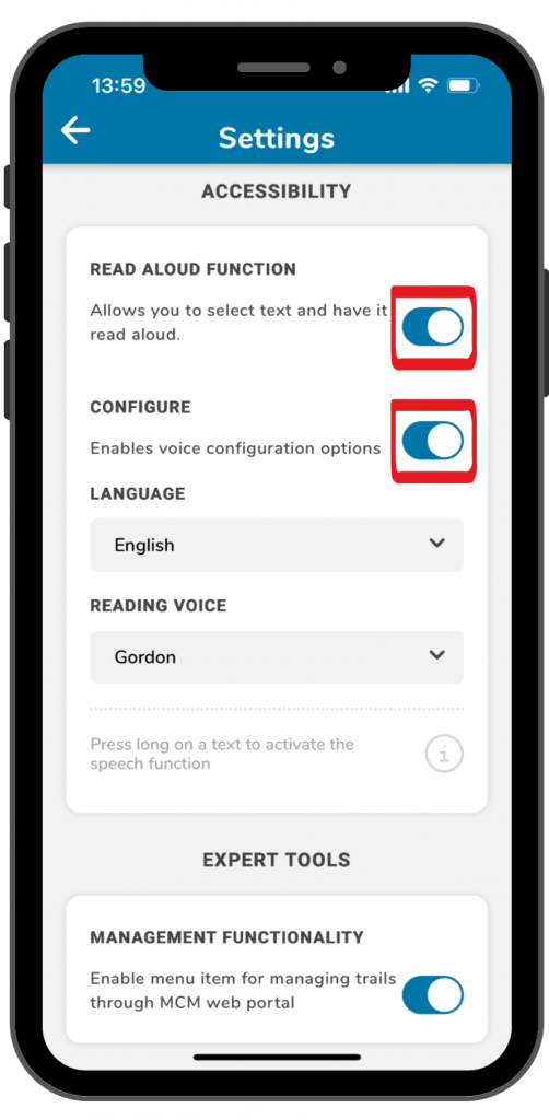 The read aloud function enables app users to listen to trail information or task assignments. Here is a step-by-step guide on how to activate and use this function: